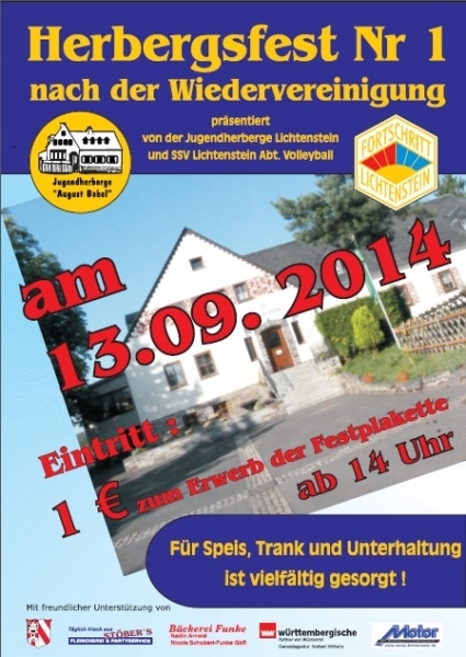 Bild vergrößern | Am 13. September 2014 präsentiert die Jugendherberge Lichtenstein und die SSV Lichtenstein Abt. Volleyball das Herbergsfest Nr 1 nach der Wiedervereinigung. Es findet an der Jugendherberge im Festzelt statt. Wir laden alle Lichtensteiner/innen und Bewohner/innen der Nachbargemeinden recht herzlich ein.