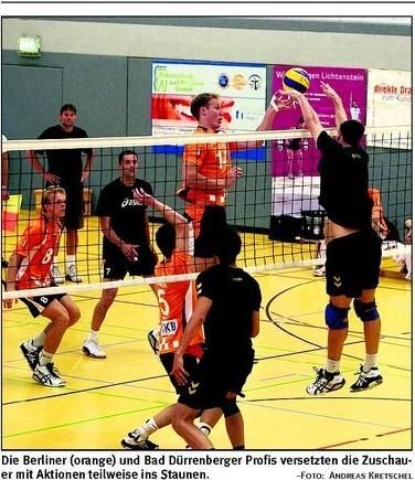 Bild vergrößern | (Lichtenstein). Anlässlich der Festlichkeiten "40 Jahre Volleyball in Lichtenstein" konnten am Freitagabend rund 200 Zuschauer miterleben, wie die Profis in der Bundesliga schmettern, blocken und nach Bällen hechten. Im Rahmen eines Testspiels in der Dreifelderhalle traten der SCC Berlin und Bad Dürrenberg/Spergau gegeneinander an.
