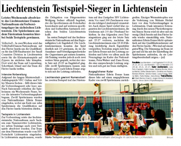 Im ersten Testspiel traf das liechtensteinische Nationalteam auf den Regioanlligisten Lok Engelsdorf. Die Liechtensteinerinnen konnten das Spiel deutlich mit 3:0 gewinnen, da sie die Annahme- und Verteidigungsschwäche der Gegnerinnen gut nutzen konnten. Als Traiing wurden jedoch noch zwei weitere Sätze gespielt, wobei der vierte Satz mit 25:19 an Engelsdorf ging. Alle zwöf Spielerinnen kamen zum Einsatz und Coach Edwin Benne zeigte sich mit der Leistung zufrieden.